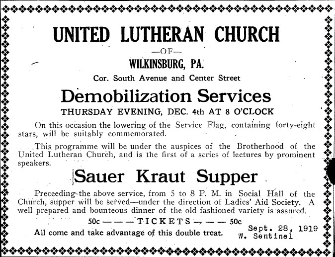 1919 — December 17. After the merger of two great Synods to form the United Lutheran Church in America, and having had friendly relations with each other, the two congregations — St. Paul’s and Calvary — decided to merge and voted to adopt the name Calvary. The Reverend Herman H. Will served as supply pastor of the new congregation, the title being “Calvary Evangelical Lutheran Church of the Pittsburgh Synod of the United Lutheran Church in America.”