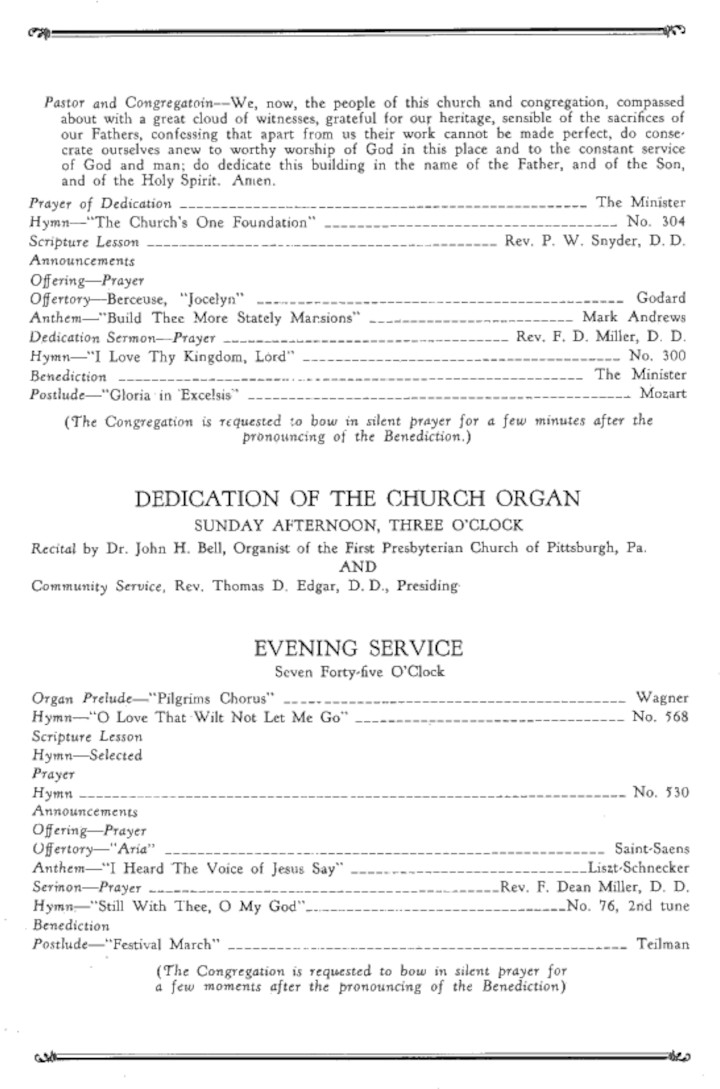 class of the Western Theological Seminary assumed the responsibility of the work and later became the pastor of the new Church. On the fourth [14th] of the following May the Church was organized. Our Church appreciated with no little affection the good work to be done in that field and for six years after the organization contributed to her current expenses. Since 1909, she has followed the path of independence and today she flourishes with a membership of seven hundred.