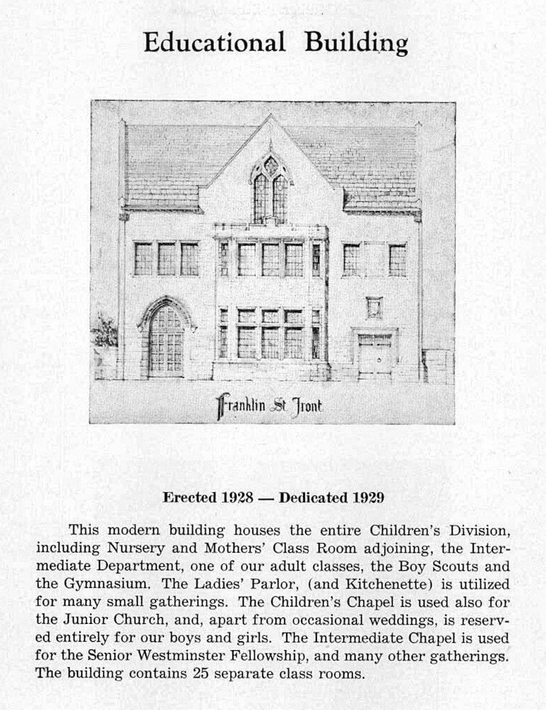 The congregation in 1922 authorized the purchase of the land for the future educational building. The planned expansion included $10,000 to rebuild the organ and $65,000 for the building the addition.