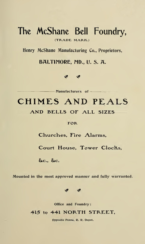 The McShane Bell Foundary, Catalog, Baltimore, Maryland, 1900. This has information on churches with bells.